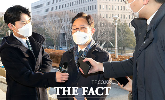 박범계 법무부 장관이 20일 오전 경기도 과천시 정부과천청사 법무부로 출근하며 취재진 질문에 답변하고 있다. /뉴시스 |