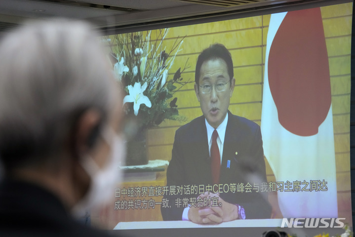 [도쿄(일본)=AP/뉴시스]지난 21일 일본 도쿄에서 게이단렌(經團連·일본경제단체연합회) 등의 주최로 열린 중일 CEO 서밋에 기시다 후미오 일본 총리가 영상 메시지를 보냈다. 2021.12.22. |
