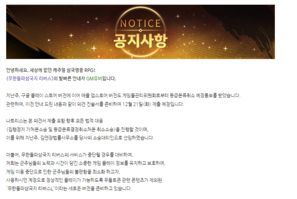 22일 관련업계에 따르면 모바일 게임 '무한돌파삼국지 리버스'를 서비스하는 나트리스는 전날 작품의 공식 채널을 통해 "게임물관리위원회에 등급분류 결정취소 사유에 대한 소명자료 및 의견 진술서를 제출했다"고 밝혔다. 이 회사는 지난 10일 작품의 블록체인 기능과 관련해 게임위로부터 등급분류 결정취소 예정 통보를 받았다.