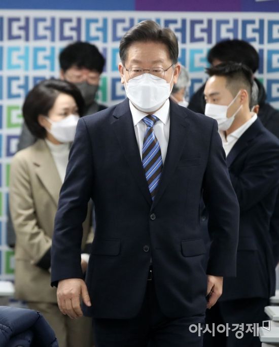이재명 더불어민주당 대선후보가 22일 서울 여의도 중앙당사에서 과학기술 정책공약을 발표하기 위해 회견장으로 들어서고 있다./윤동주 기자 doso7@ |