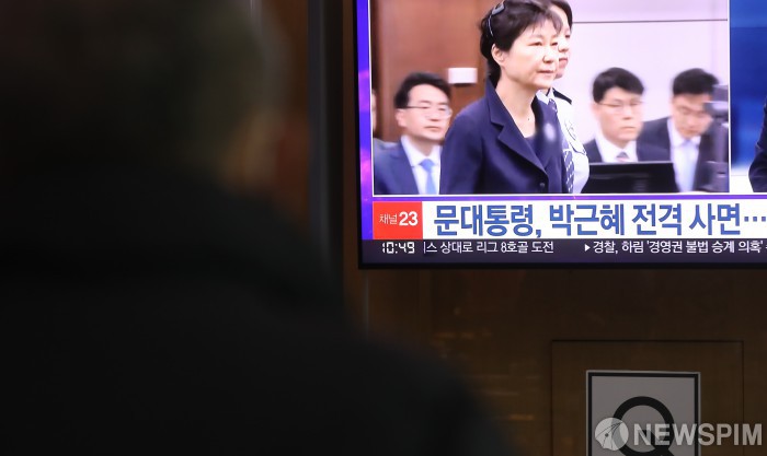 [서울=뉴스핌] 김민지 인턴기자 = 국정농단 사건으로 수감 중인 박근혜 전 대통령의 특별사면이 발표된 24일 오전 서울역 대합실에 관련 뉴스가 나오고 있다. 2021.12.24 kimkim@newspim.com