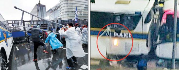 차 벽 부수고 경찰버스에 불붙이려 했던 시위대 - 2015년 11월 14일 ‘민중총궐기’ 당시 한 집회 참가자가 사다리로 경찰 버스를 파손하려는 모습(왼쪽 사진). 시위대 일부는 경찰 버스 주유구에 불을 붙인 신문지를 넣으려고 했지만, 매연 저감 장치를 주유구로 착각하는 바람에 실패했다. /연합뉴스 |