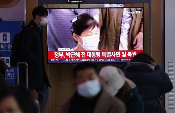 24일 오전 서울역에서 시민들이 박범계 법무부 장관의 사면 관련 발표 방송을 보고 있다. 연합뉴스 |