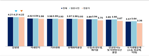 조사 결과 감염병, 미세먼지, 기후변화, 유해화학물질 등 7가지 보건환경 위험 요인 중 서울시민의 삶의 질에 가장 큰 영향을 미치는 위험 요인은 감염병(4.51점)으로 집계됐다. 미세먼지는 4.25점, 기후변화는 4.09점으로 상대적으로 위험하다고 느끼는 정도가 낮았다.