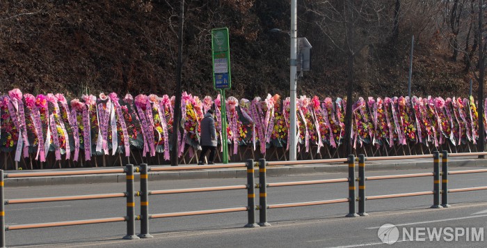 [서울=뉴스핌] 윤창빈 기자 = 박근혜 전 대통령의 특별사면을 앞둔 30일 오후 서울 강남구 삼성서울병원 앞에 지지자들이 가져다 놓은 화환이 줄지어 있다. 2021.12.30 pangbin@newspim.com