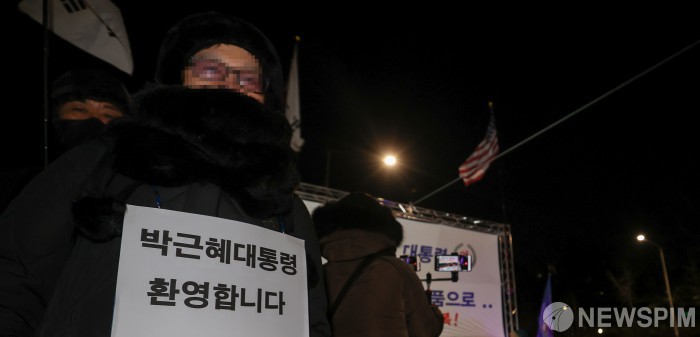 [서울=뉴스핌] 최상수 기자 = 박근혜 전 대통령의 신년 특별사면 전날인 30일 저녁 서울 강남구 삼성서울병원 앞에서 태극기혁명국민운동본부의 박근혜 전 대통령 환영 및 탄핵 무효 주장 집회가 열리고 있다. 2021.12.30 kilroy023@newspim.com