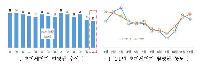 이는 관측을 시작한 2008년 26㎍/㎥ 대비 약 23% 감소했으며, 2020년의 21㎍/㎥과 비교해서도 1㎍/㎥ 줄어든 수치다.