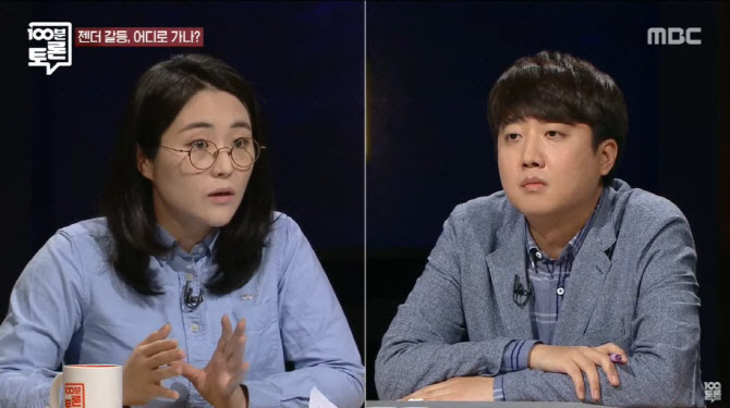 과거 MBC ‘100분 토론’ 중 ‘젠더 갈등, 어디로 가나?’ 편에 함께 출연했던 신지예 국민의힘 새시대위원회 수석부위원장과 이준석 국민의힘 대표 |