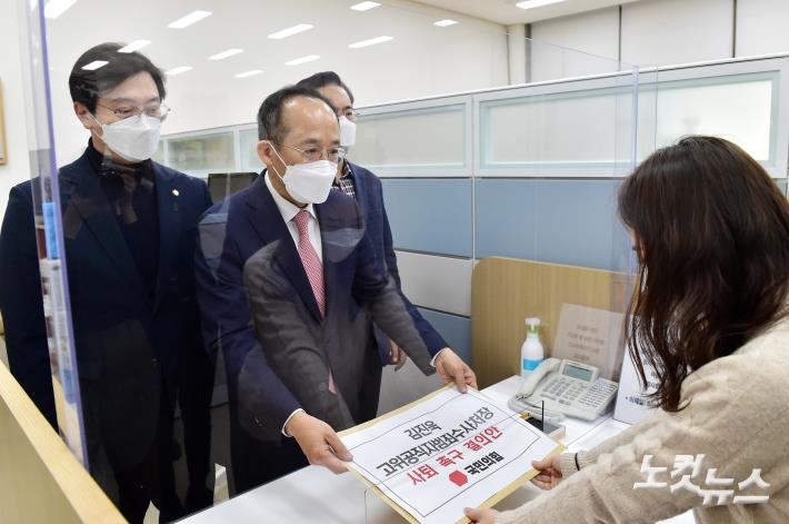 추경호 국민의힘 원내수석부대표와 강민국 원내대변인, 유상범 의원이 3일 국회 의안과에 김진욱 고위공직자범죄수사처장 사퇴 촉구 결의안을 제출 하고 있다.