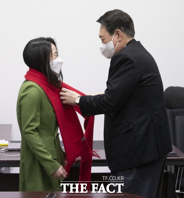 윤석열 국민의힘 대선 후보는 3일 신지예 새시대준비위원회 부위원장 전격 사퇴에 "애초에 없어도 될 논란을 만든 제 잘못"이라며 사과했다. 지난달 20일 새시대준비위원회 위원장실에서 열린 영입인사 환영식에서 녹색당 공동운영위원장을 지낸 신지예 한국여성정치네트워크대표를 환영하며 붉은색 목도리를 매주는 윤 후보. /이선화 기자 |