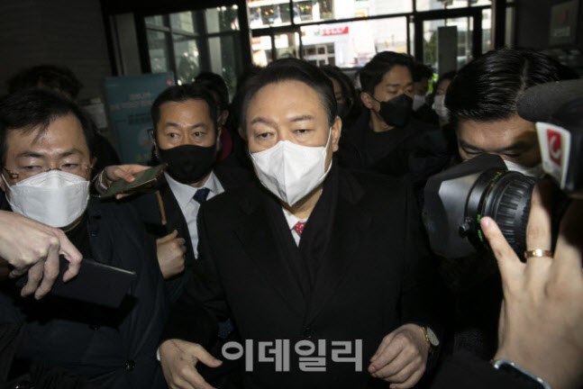 윤석열 국민의힘 대선후보가 3일 오전 갑작스럽게 이후 일정을 취소하고 서울 영등포구 국민의힘 당사로 들어오고있다. (사진=방인권 기자) |