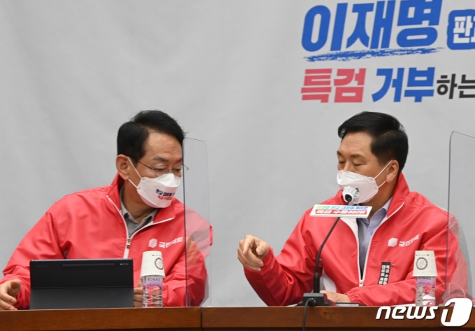 (서울=뉴스1) 이동해 기자 = 30일 오전 국회에서 열린 국민의힘 원내대책회의에서 김기현 원내대표가 김도읍 정책위의장과 현안을 논의하고 하고 있다. 2021.11.30/뉴스1 |