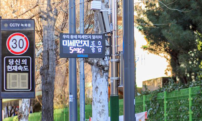 구는 지난해 11월부터 초등학교, 어린이공원, 유동인구가 많은 도로변 등 28곳에 미세먼지 측정망을 구축했다. 미세먼지 측정망에 포함된 대기오염 알리미(대기오염안내 전광판 및 미세먼지 신호등)는 대기오염 경보 등이 발령될 경우 현재 상황 및 시민 행동요령 등을 전광판을 통해 곧바로 안내할 수 있다.