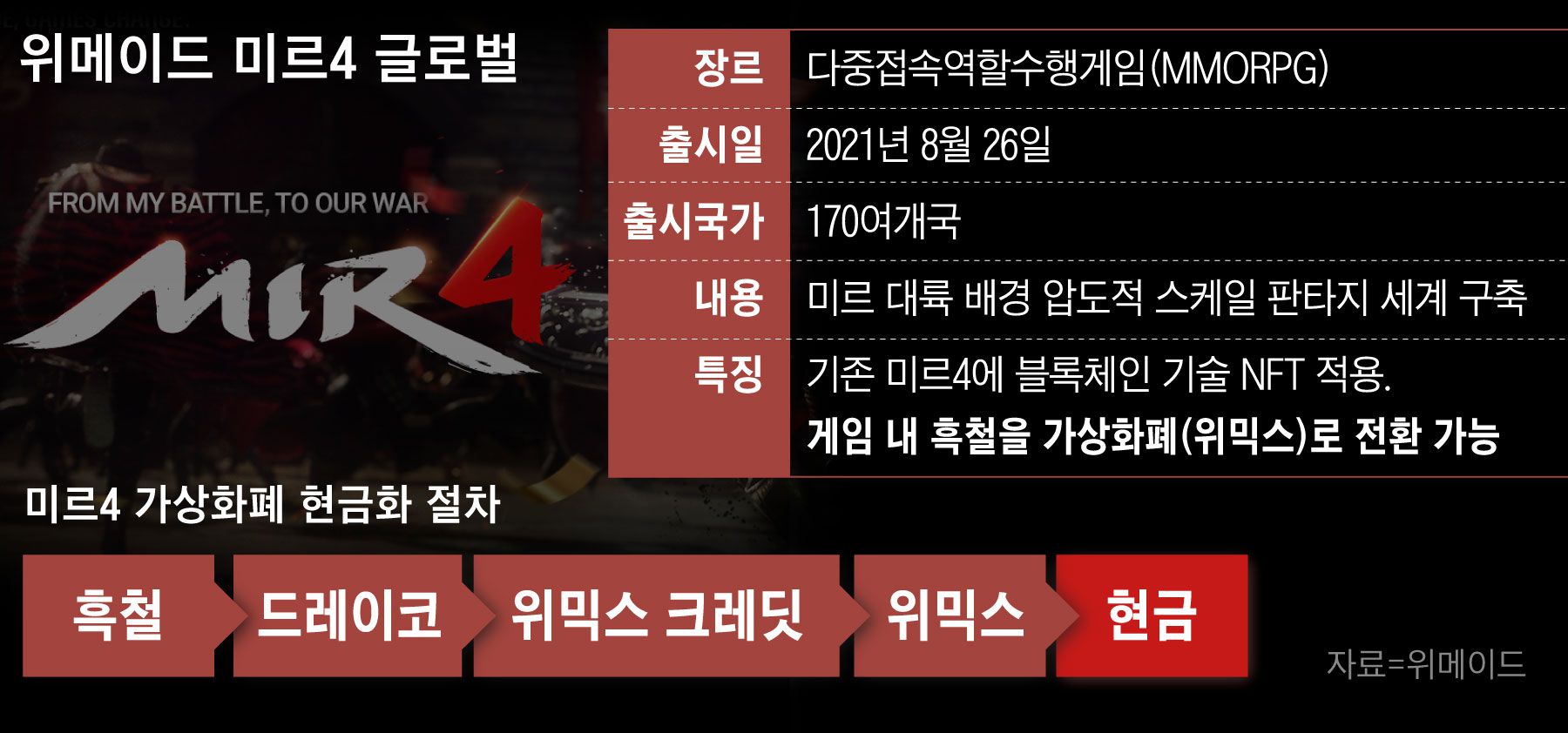 흑철 10만개를 모으면 드레이코 1개로 교환할 수 있다. 이 드레이코를 위메이드의 가상화폐 지갑인 ‘위믹스 월렛’에서 위믹스로 다시 바꾸면 된다. 위믹스는 국내 가상화폐 거래소인 ‘빗썸’에서 현금화할 수 있다. 이런 과정을 모두 해내려면 미르4뿐 아니라, 위믹스 월렛, 빗썸의 모바일 애플리케이션(앱)과 계정을 모두 등록해야 한다. 게임만 한다고 돈을 벌 수 있지는 않았다.