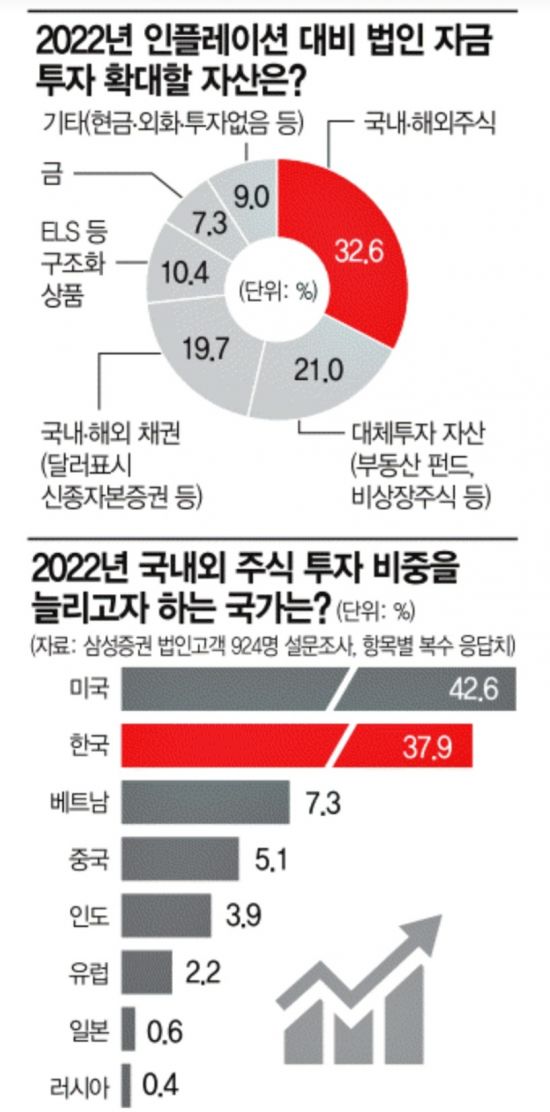주식 투자 지역으로는 미국 주식의 투자 비중을 늘리겠다는 응답 비율이 42.6%로 국내 주식(37.9%)보다 높았다. 지난해에는 국내주식이 최선호 자산이었던 것에 비해 상이한 모습으로 경영진의 금융 자산 투자 판도에도 변화가 감지되고 있음이 간접적으로 확인됐다고 삼성증권은 설명했다.