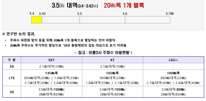 과기정통부는 지난달 3일 LG유플러스가 추가 할당한 해당 대역폭을 추가 공급하기로 결정했다. 이 대역은 LG유플러스가 현재 활용 중인 대역과 맞붙어있다. 과기부는 주파수 파편화를 방지하기 위해 3.4~3.42㎓ 대역 주파수 가운데 20㎒폭의 주파수를 1개 블록으로 할당하는 것이 바람직하다는 입장이다. 사실상 LG유플러스가 실질적 수요자가 된다. 다른 통신사가 해당 주파수를 사용하려면 추가로 주파수 집성 시설을 마련하는 등 상당한 비용이 발생한다.