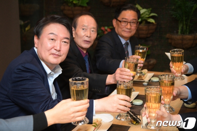 (서울=뉴스1) 오대일 기자 = 윤석열 국민의힘 대선 후보가 23일 서울 여의도의 한 음식점에서 열린 대선 경선 주자들과의 오찬 회동에서 '물잔 건배'를 하고 있다. 왼쪽부터 윤 후보, 장기표 신문명정책연구원장, 박찬주 전 육군대장. 2021.11.23/뉴스1 |