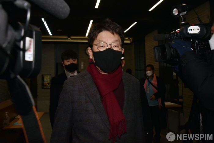 [서울=뉴스핌] 최상수 기자 = 사무총장을 사퇴한 권성동 의원이 5일 오후 서울 여의도 국민의힘 중앙당사를 나서고 있다. 2022.01.05 kilroy023@newspim.com