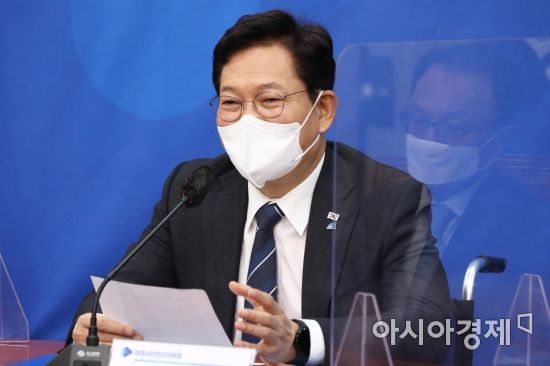 송영길 더불어민주당 선대위원장이 4일 국회에서 열린 선대위 대한민국 대전환 미래시민광장위원회 출범식에 참석, 축사를 하고 있다./윤동주 기자 doso7@ |