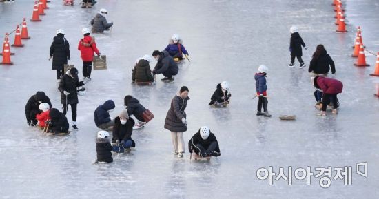 4일 경기 김포시 금빛수로에 만들어진 ‘얼음썰매장’에서 어린이들이 썰매를 타며 즐거운 시간을 보내고 있다. 금빛수로 얼음썰매장은 13세 이하의 아동을 대상으로 무료로 운영되고 코로나19 사회적 거리두기 방역에 따라 이용 정원이 보호자 동반 포함 100명으로 제한된다. 다음달 2일까지 열린다. /문호남 기자 munonam@ |