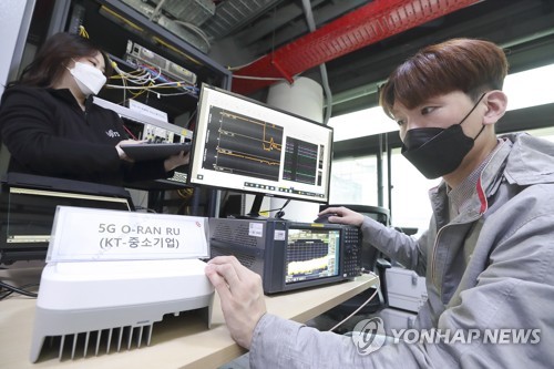 (서울=연합뉴스) 조성흠 기자 = KT[030200]는 일본 NTT도코모, 후지쯔와 5G 기지국 장비의 호환성을 높여주는 개방형 무선접속망(Open RAN) 테스트베드를 서울 KT 융합기술원에 구축하고 개방형 5G 기지국의 상호 연동시험에 성공했다고 6일 밝혔다.