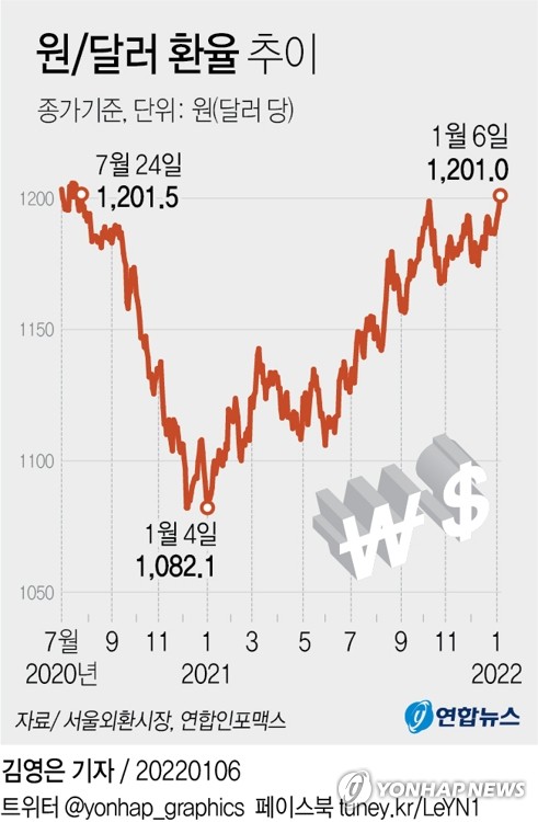 (세종=연합뉴스) 차지연 곽민서 기자 = 원/달러 환율이 1년 5개월여 만에 달러당 1천200원 선을 돌파하면서 가뜩이나 상승세를 탄 물가 오름폭이 커질 수 있다는 우려가 나온다.