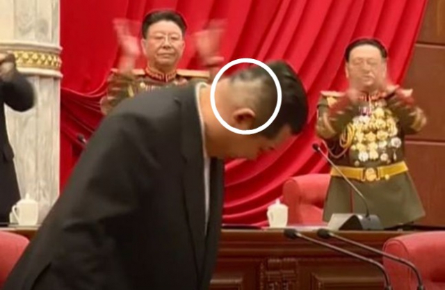 5일 조선중앙TV가 공개한 영상을 보면 김 위원장의 뒤통수에 테이프를 붙인 뒤 뗀 것으로 추정되는 하얀 자국이 남아 있다. 지난주 노동당 8기 4차 전원회의 당시의 영상이다.