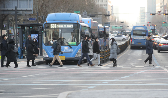 지난 5일 오전 출근시간 시민들이 서울 세종대로사거리를 걷고 있다. 〈사진=연합뉴스〉 |