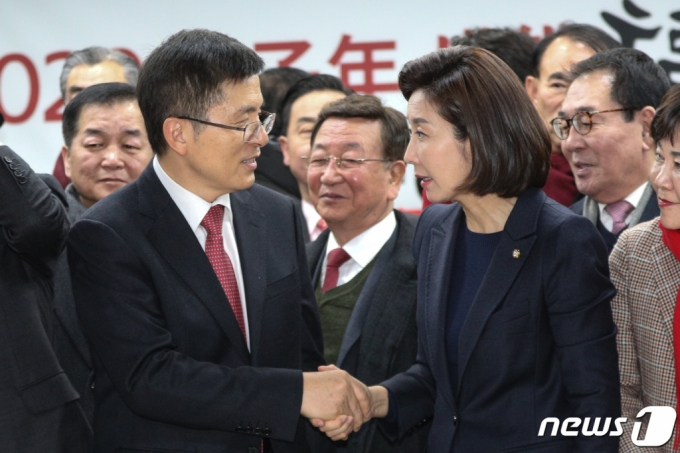 (서울=뉴스1) 성동훈 기자 = 황교안 자유한국당 대표와 나경원 서울시당 위원장이 16일 오전 서울 영등포구 자유한국당 중앙당사에서 열린 '자유한국당 서울시당 신년인사회'에서 악수를 하고 있다. 2020.1.16/뉴스1 |