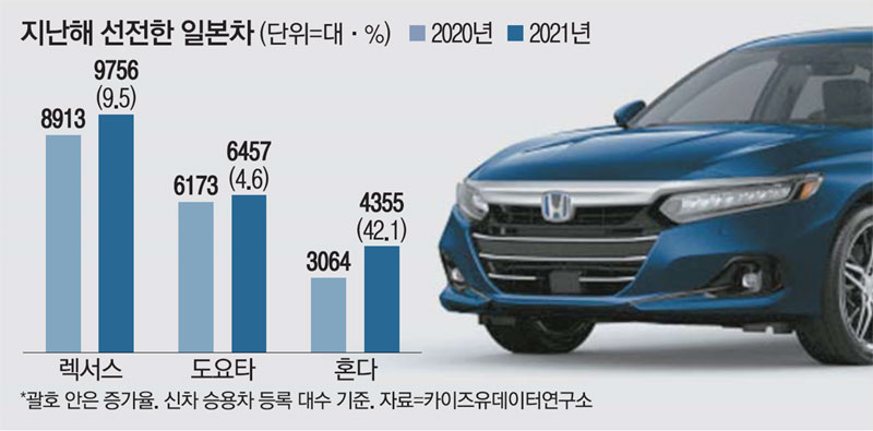 일단 일본차가 선전한 것은 불매운동이 수그러든 영향으로 보인다. 2019년부터 일본차 불매운동이 시작되면서 닛산과 인피니티가 같은 해 한국 시장에서 철수하기도 했다. 2020년 일본차 5사(도요타·렉서스·혼다·닛산·인피니티) 판매량은 전년보다 43.9%나 줄어든 2만564대를 기록했다.