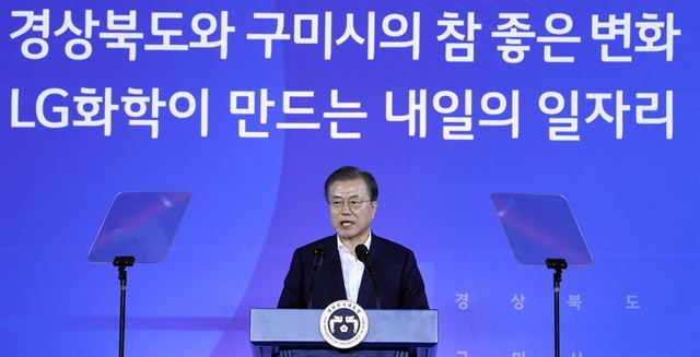 문재인 대통령이 지난 2019년 7월 25일 경북 구미 컨벤션센터인 구미코에서 '상생형 구미 일자리 투자 협약식' 후 인사말을 하고 있다. [연합] |
