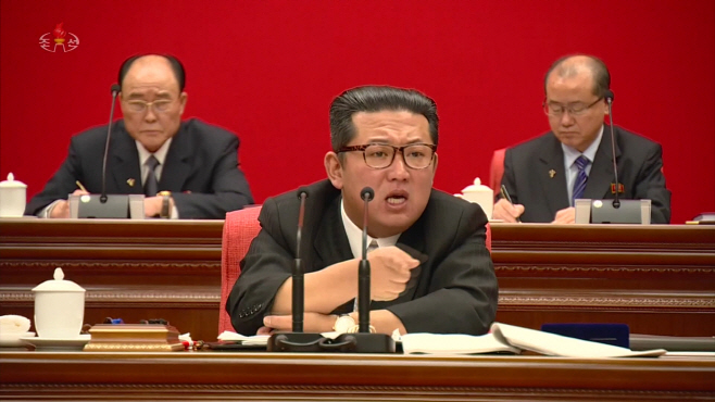김정은 북한 국무위원장이 지난달 27∼31일 노동당 제8기 제4차 전원회의 도중 인상을 찌푸린 채 참석자들을 질타하고 있다./사진=조선중앙TV 화면=연합뉴스 |