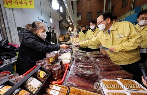 김 총리는 설 성수품을 직접 구매하면서 과일, 육류, 떡 등의 수급 상황과 체감 물가에 대한 의견을 듣고 시장 상인과 방문객들에게 마스크를 나눠주기도 했다.