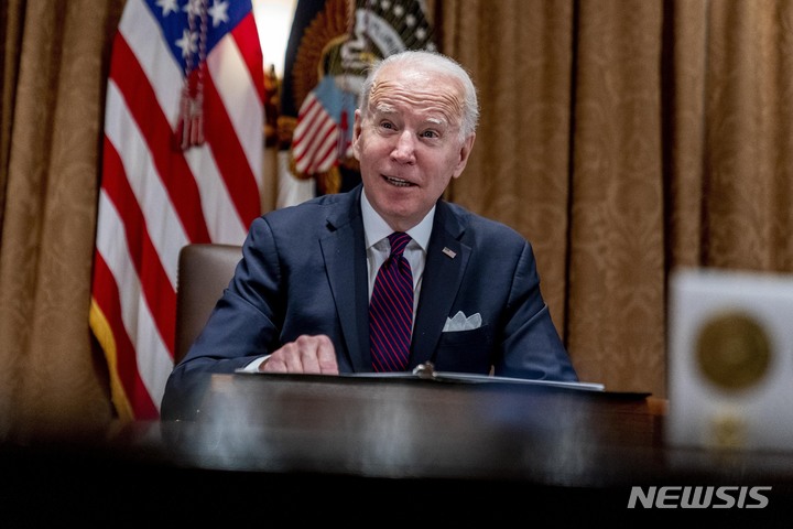 [워싱턴DC(미국)=AP/뉴시스]20일(현지시간) 미국 워싱턴DC의 백악관 사무실에서 조 바이든 대통령이 사회 인프라 법안 논의를 위해 관련 태스크포스 멤버들과 만나고 있다. 2022.01.21. |