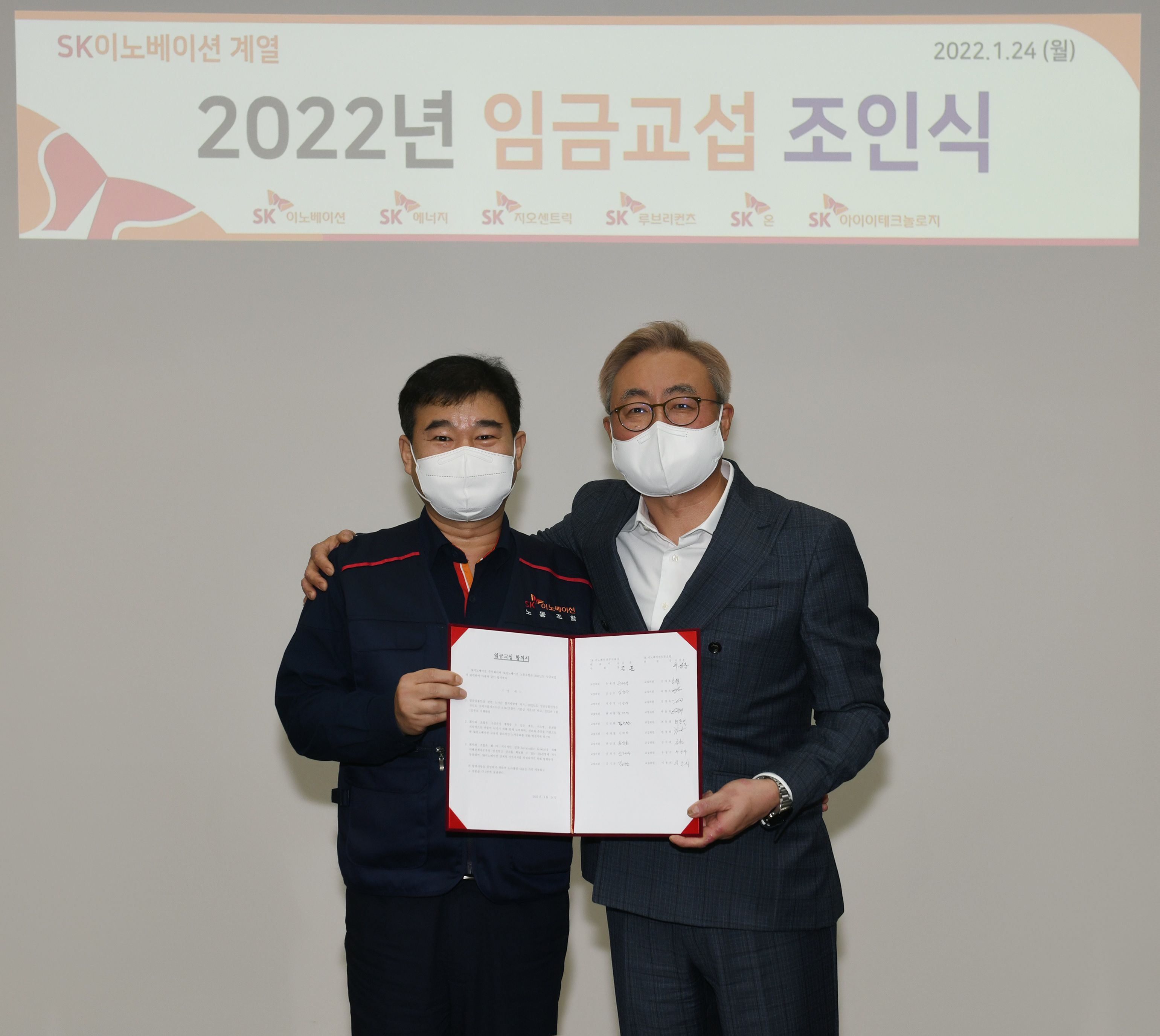 SK이노베이션 노사는 24일 울산CLS에서 ‘2022년도 임금교섭 조인식’을 열고 임금협상을 타결했다. 이번 조인식은 매년 본사에서 개최하던 관례를 깨고 김준 부회장 등 경영진이 직접 울산CLX를 찾았다.