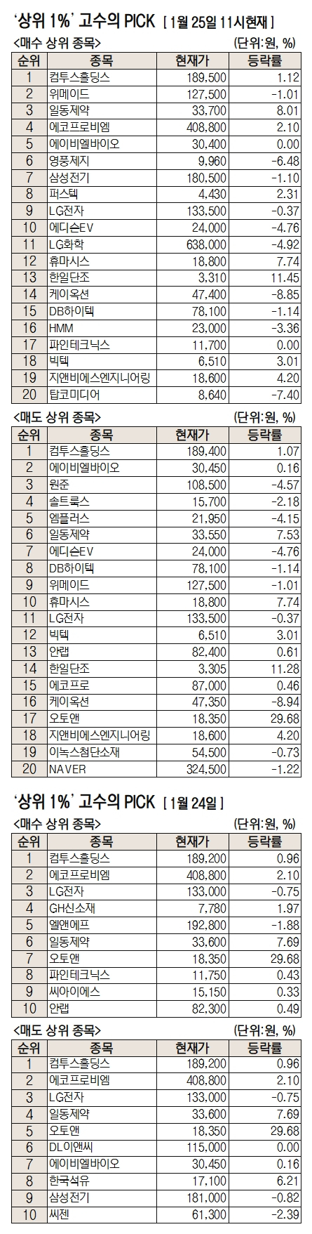전 거래일인 24일 고수익 투자자들이 가장 많이 사들인 종목은 컴투스홀딩스였다. 에코프로비엠, LG전자(066570), GH신소재(130500), 엘앤에프(066970)가 그 뒤를 이었다. 같은 날 매도량이 가장 많은 종목도 컴투스홀딩스였다. 에코프로비엠, LG전자, 일동제약, 오토앤(353590)이 그 다음이었다.