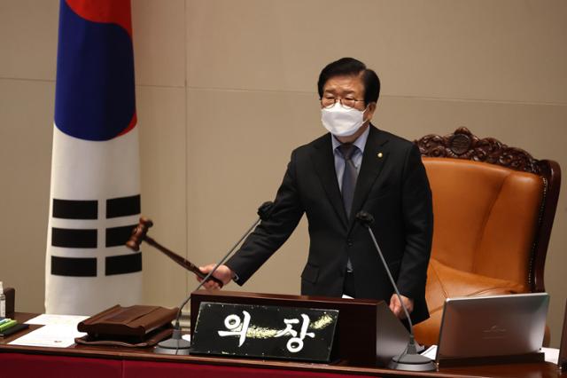 박병석 국회의장이 11일 국회 본회의에서 정당에 가입할 수 있는 연령을 현행 만 18세에서 만 16세로 낮추는 내용의 정당법 개정안 등 상정된 법안을 의결하고 있다. 오대근 기자 |