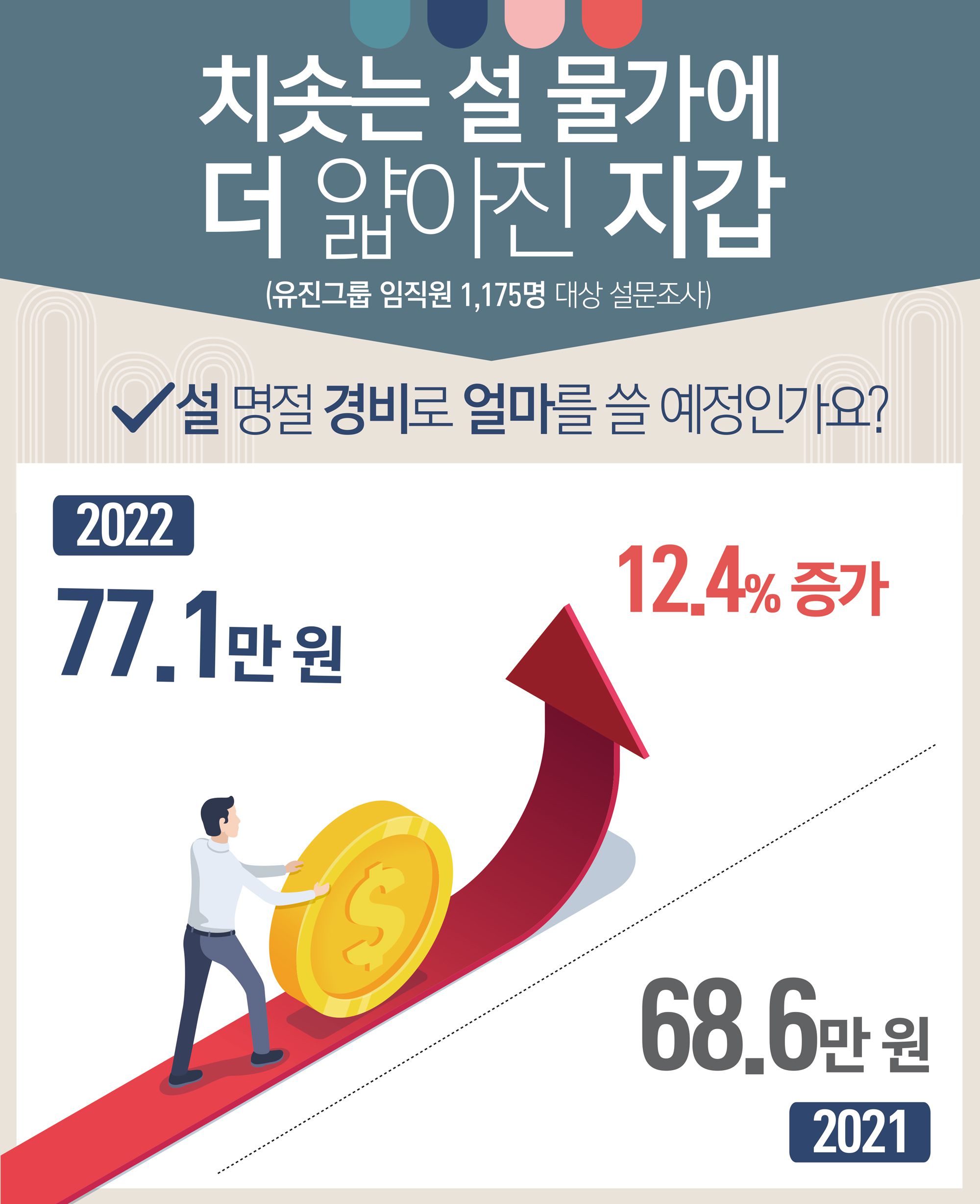 특히 지난해 30대와 40대의 지출 예상액(작년 기준 62만1000원, 77만9000원)이 올해 들어 각각 15.3%, 8.3% 수준 증가하며, 전체 평균액 상승에 기여한 것으로 나타났다. 유진그룹은 지난해 대비 가파른 설 물가 상승과 더불어 3040 세대의 귀향 계획에 따른 증가세로 해석했다.