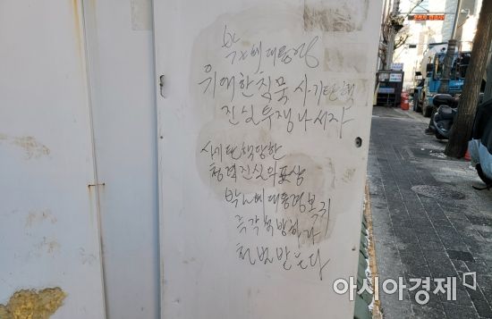 서울 중구 을지로 한 공사장 인근 철제 보호막에 박근혜 전 대통령을 지지하는 글이 쓰여있다. 사진=한승곤 기자 hsg@asiae.co.kr |