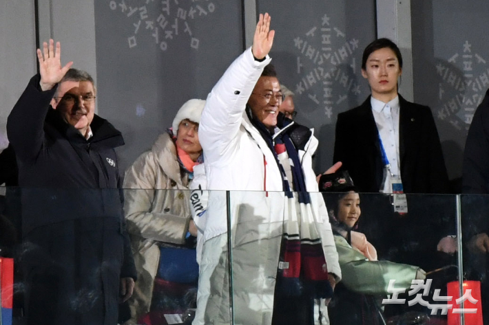 지난 2018 평창동계올림픽 개회식에서 문재인 대통령과 토마스 바흐 IOC 위원장이 손을 들어 인사하고 있다. 이한형 기자 |