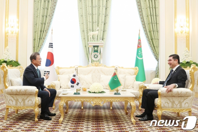 문재인 대통령이 지난 2019년 4월17일(현지시간) 투르크메니스탄 대통령궁에서 구르반굴리 베르디무하메도프 대통령과 단독회담을 하고 있다. (청와대 제공)2019.4.18/뉴스1 |