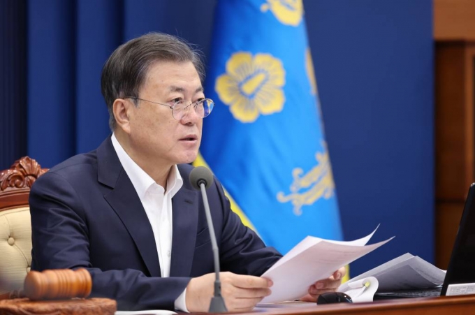 [서울=뉴시스 전진환 기자 = 문재인 대통령이 8일 오전 청와대 여민관에서 열린 영상 국무회의에 참석해 발언하고 있다. 2022.02.08. |