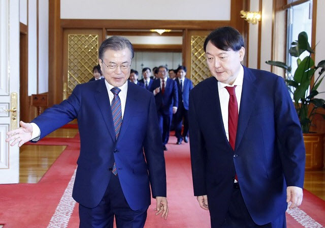 2019년 7월 25일 당시 신임 검찰총장 임명장 수여식을 마친 뒤 환담장으로 이동하는 문재인 대통령과 윤석열 당시 신임 검찰총장 (사진=연합뉴스) |