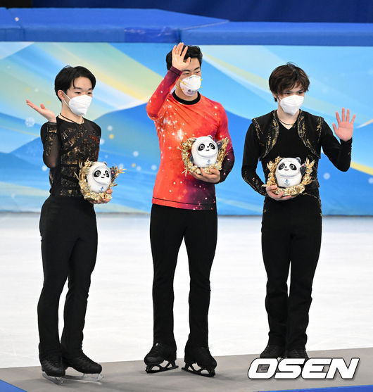 금메달을 획득한 미국 네이선 첸이 은메달을 획득한 일본 카기야마 유마, 동메달을 획득한 일본 우노 쇼마와 함께 관중석을 향해 손을 흔들고 있다. 2022.02.10 /jpnews@osen.co.kr