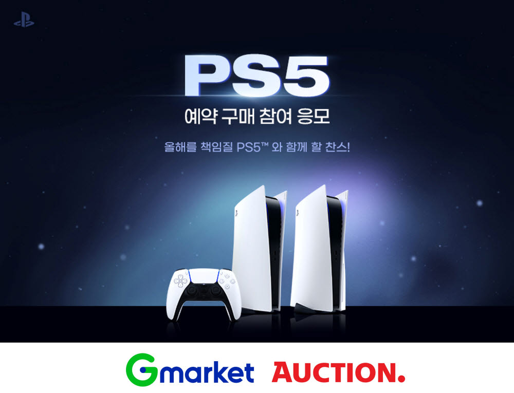G마켓과 옥션은 11일 정오부터 13일 자정까지 'PS5 예약구매 참여 응모 이벤트'를 진행한다고 11일 밝혔다. 100원 응모권을 구입 후 당첨되면 PS5 예약구매 기회를 얻을 수 있다.