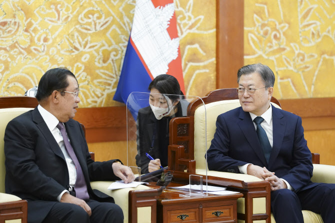 문 대통령은 지난 2019년 캄보디아를 국빈방문해 프롬펜 평화궁에서 훈센 총리와 정상회담을 가졌다.