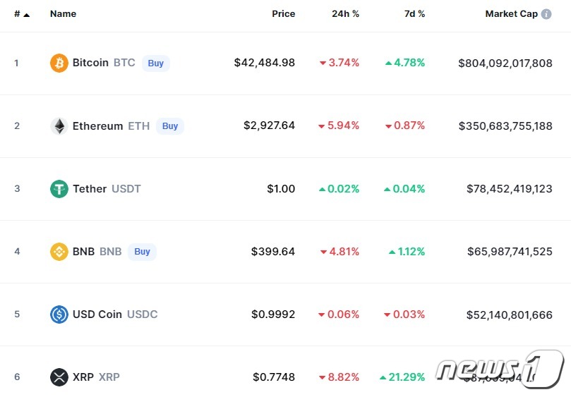 이 시각 현재 주요 암호화폐 시황 - 코인마켓캡 갈무리 |