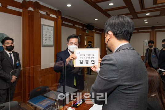 김동연 새로운물결 대선 후보가 13일 오전 11시 선관위에 대통령선거 후보자 등록신청서를 내고 있다. (새로운물결 제공) |