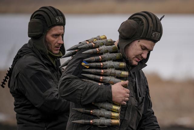 10일 우크라이나 동부 도네츠크의 합동작전 통제구역에서 훈련 중인 한 현지 병사가 탄약을 운반하고 있다. 도네츠크=AP 연합뉴스 |