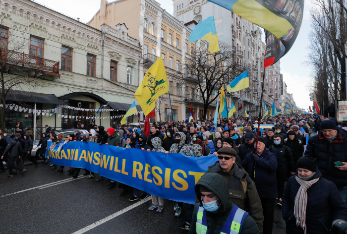 저항 결의 다지는 우크라이나 시민들 러시아의 침공 위험에 직면한 우크라이나 시민 수천명이 12일(현지시간) 수도 키예프 도심에서 “우크라이나인은 저항할 것이다”라고 쓰인 현수막을 들고 행진하고 있다. 키예프 | EPA연합뉴스 |